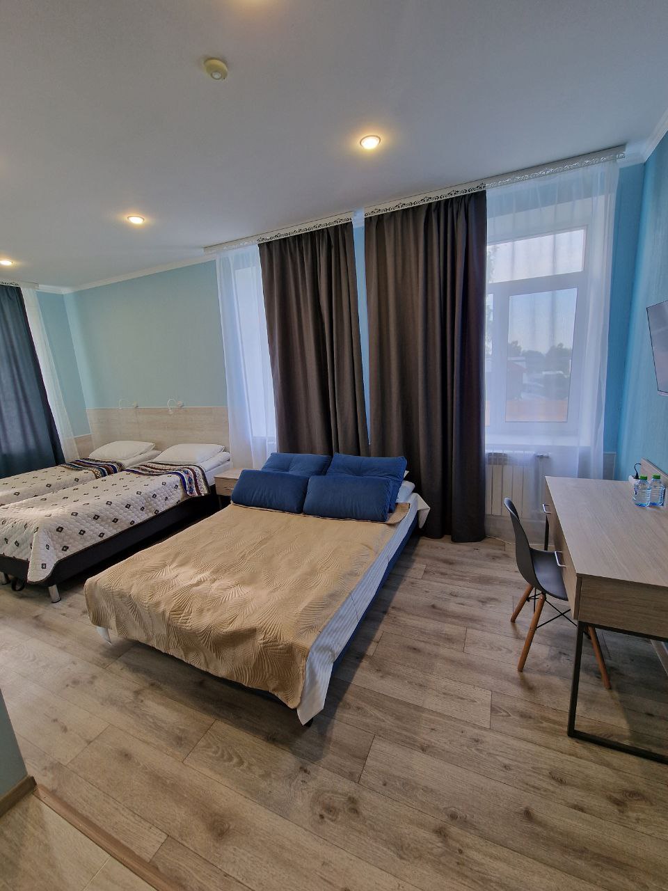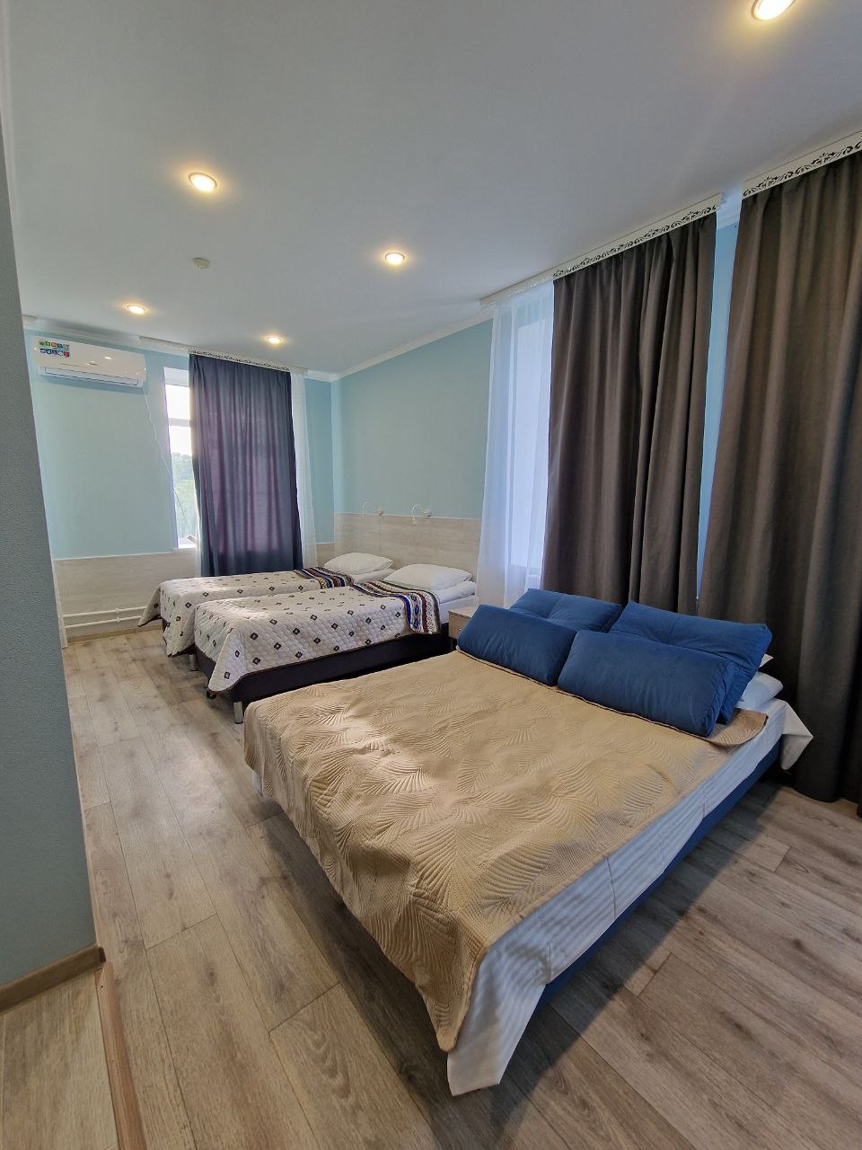 Рассчитан на 4 посетителя Просторный номер с одной большой или двумя раздельными кроватями и раскладным диваном на два спальных места, оформленный в светло-голубых тонах, оснащенный всем необходимым: телевизор, кондиционер, собственный сан узел с душевой кабиной. Зона кухни, оснащенная: холодильник, микроволновка, посуда, электрочайник. Номер С видом на главную улицу поселка и зону парковки